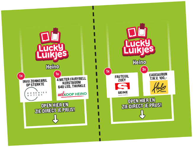 Maandag 6 oktober start de Lucky Luikjes-campagne in Heino. Wij doen ook mee omdat wij lid zijn van de ondernemersvereniging. Bij elke aankoop ontvangt de klant maximaal 1 gratis kanskaart (met daarop 2 luikjes). De uitgifteperiode is van 6 oktober t/m eind oktober. Onder elk luikje zit een prijs verscholen, gedoneerd door een van de deelnemende ondernemers. Winnaars kunnen de prijs bij de desbetreffende ondernemer ophalen. Voor meer informatie en een overzicht van alle deelnemers kan de klant een flyer meenemen of kijken op www.luckyluikjes.nl/heino